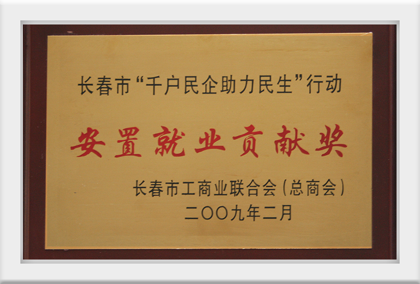 2009年2月榮獲長春市“千戶民企助力民生”行動(dòng)安置就業(yè)貢獻(xiàn)獎(jiǎng)