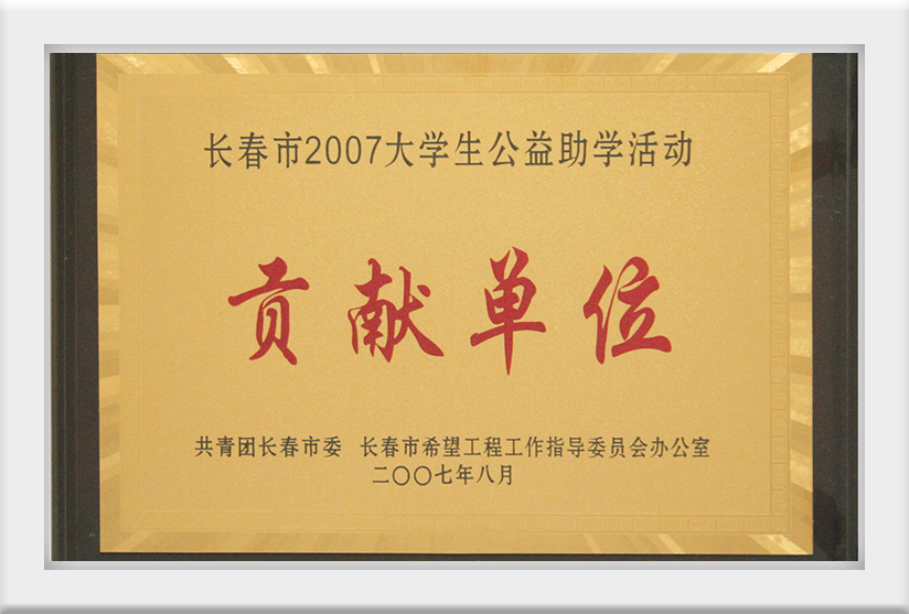 2007年8月榮獲長春市2007大學(xué)生公益助學(xué)活動(dòng)貢獻(xiàn)單位
